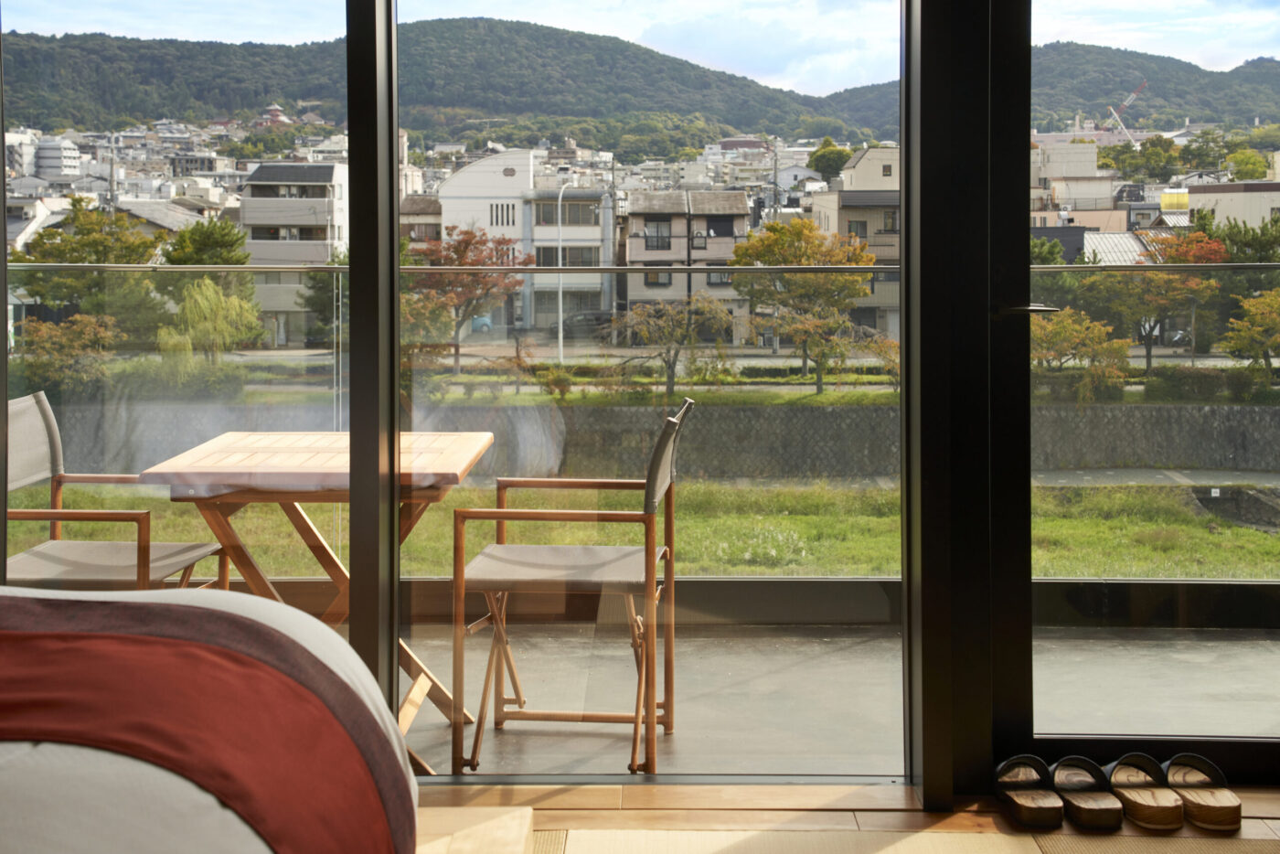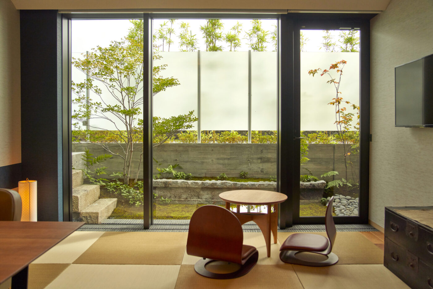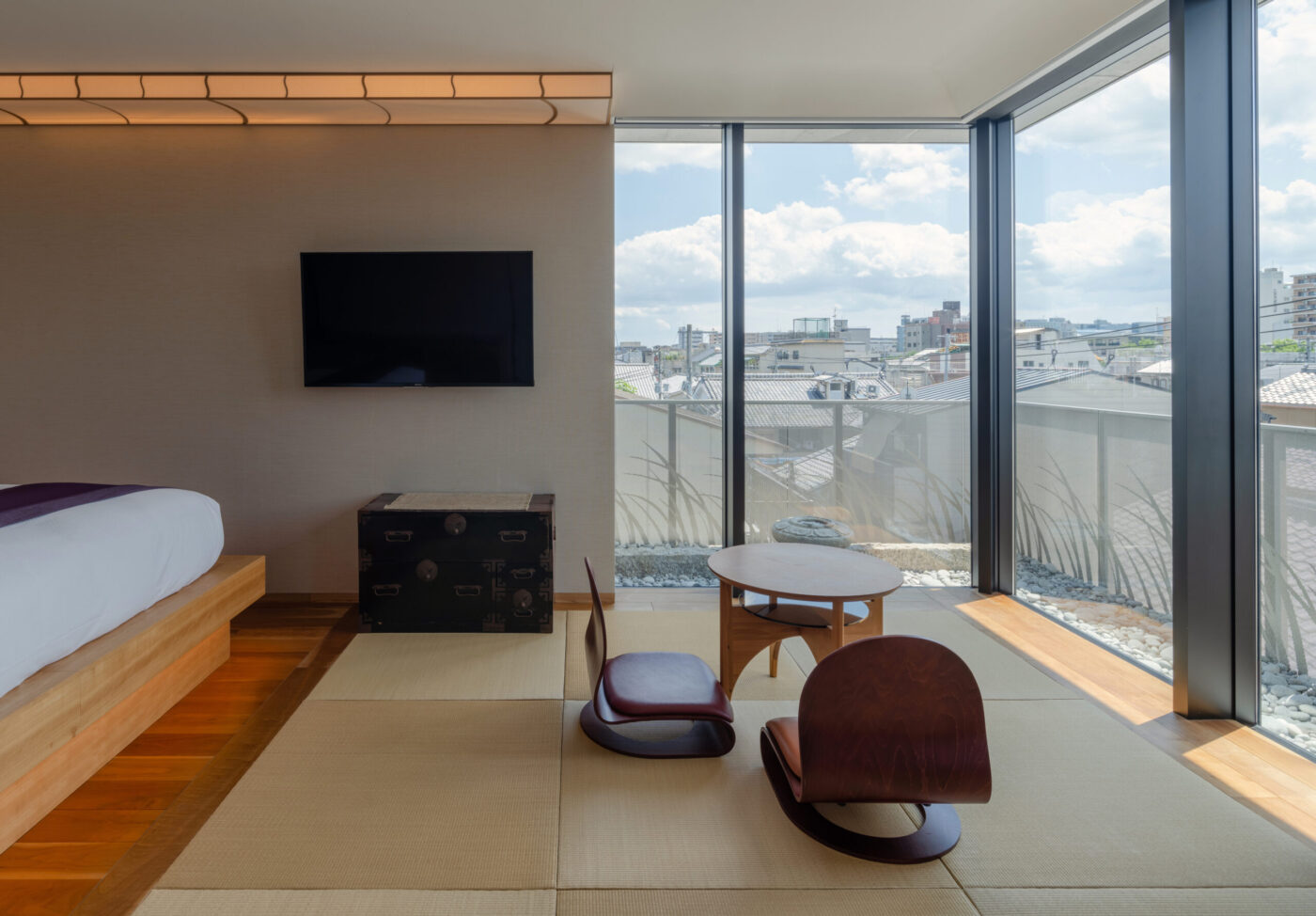 和の要素を大切に、現代的な快適さを無理なく取り入れた室内。畳の落ち着き、素材の手触り、窓の外に広がるのは、鴨川の気配や京都の街の日常。余計な装飾をそぎ落とした落ち着きと、心地よさが、京都に「滞在している」感覚を静かに深めてくれます。部屋ごとに異なる表情を持ちながらも、一貫して感じられるのは、静かに過ごすこと。読書をする、思考を休める、何もしない時間を受け止める。そんな過ごし方が自然に馴染みます。観光のための拠点ではなく、滞在そのものを楽しむための客室です。