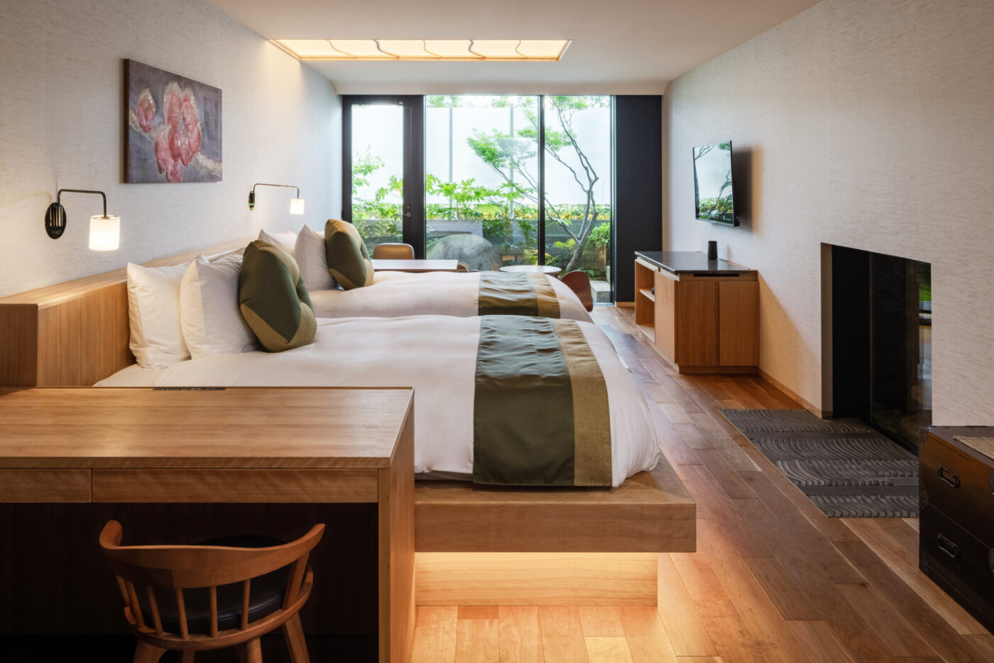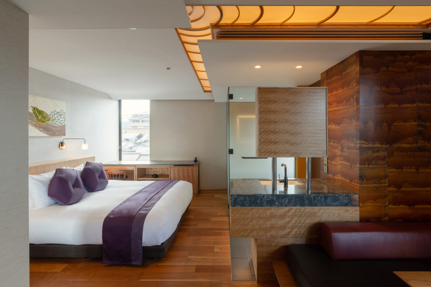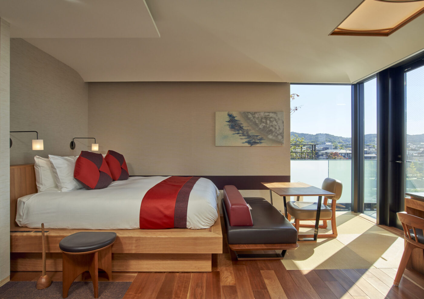 和の要素を大切に、現代的な快適さを無理なく取り入れた室内。畳の落ち着き、素材の手触り、窓の外に広がるのは、鴨川の気配や京都の街の日常。余計な装飾をそぎ落とした落ち着きと、心地よさが、京都に「滞在している」感覚を静かに深めてくれます。部屋ごとに異なる表情を持ちながらも、一貫して感じられるのは、静かに過ごすこと。読書をする、思考を休める、何もしない時間を受け止める。そんな過ごし方が自然に馴染みます。観光のための拠点ではなく、滞在そのものを楽しむための客室です。