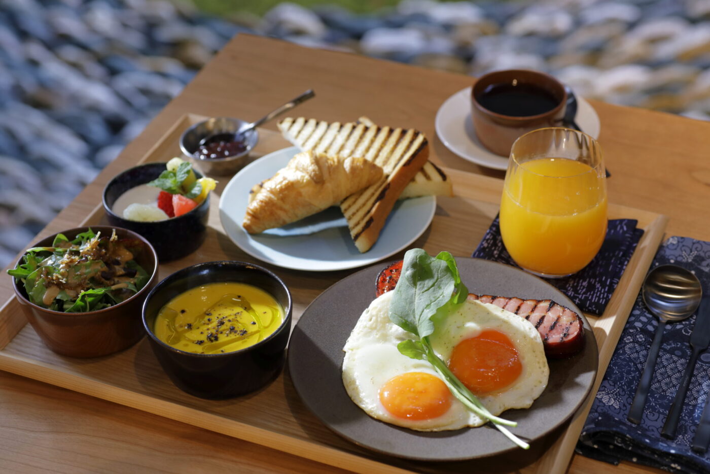 ダイニングでは、時間帯を限定せず、軽食からしっかりとした一皿、甘い余韻までをアラカルトで楽しむことができます。朝は、コンチネンタルブレックファスト、洋朝食や和朝食など、その日の気分に合わせて選べる内容。静かな空間で味わう朝の一皿が、京都での一日を穏やかに整えてくれます。食事は、ラウンジや客室、屋上のスカイフォレストガーデンでも。場所を選ばず、自分のペースで楽しめるのも、この宿ならでは。一日の始まりにも終わりにも、ここでの食事は、旅の時間をゆるやかに整えてくれます。